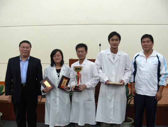 闭幕式上,化生系主任范洪波教授对本次技能大赛进行了全面的点评,并对同学们在未来的专业学习中寄予厚望。最终,由徐平如老师指导的“改性聚乙烯醇缩甲醛胶的制备”获得了特等奖,获奖选手分别是罗静田、张捷骏、黄安,杨院长和王董事长为获得特等奖的小组颁奖。该小组将代表学院参加明年广东省普通高校第一届大学生化学实验技能竞赛。