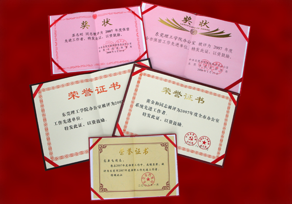 在2007年度全市办公室系统总结表彰会议上,我院办公室荣获多项奖项,包括:学院办公室被评为全市保密工作先进单位、全市档案工作先进单位以及市调研工作表扬单位;黄金和同志被评为全市办公室系统先进工作者;高单飞同志被评为东莞市档案工作先进工作者;苏志刚同志被评为保密先进工作者。