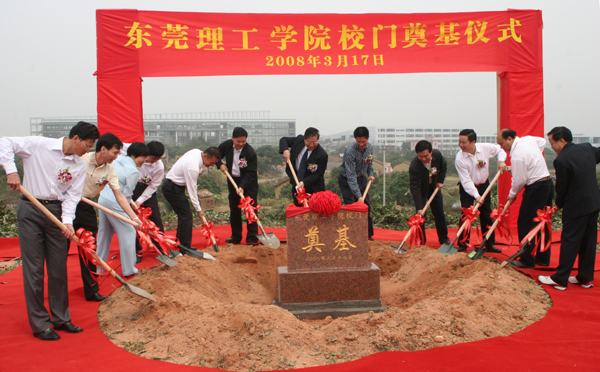 我院校门奠基典礼仪式昨日上午举行。学院党委书记周致纳、院长杨晓西,东莞市大朗镇党委书记尹景辉、松山湖管委会副主任蒋亚军等主礼奠基仪式。