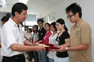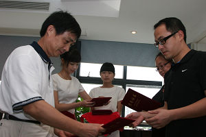 座谈会前,王江水副书记和李培经部长分别为获得“2007—2008年度优秀通讯员”称号的16名师生颁发了证书。