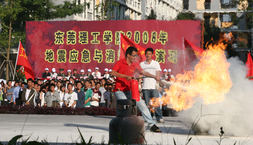 演习模拟地震灾害的部分过程,在演习中学习防震、抗震、防火、灭火知识,提高大家的自防自救能力。经历过四川大地震的我校新生徐刚同学现场说法,以其亲身经历告诉同学如何更有效地避险。