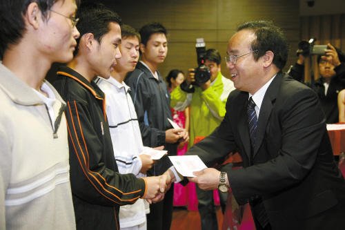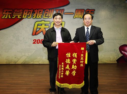 3月26日,“时报玉兰”助学金发放仪式在东莞报业大厦举行,我校共有20名家庭经济困难学生受助,资助金额达每人2000元。校党委副书记王江水同志出席仪式并向捐赠单位《东莞时报》赠送锦旗。“时报玉兰”助学金由《东莞时报》于2008年在我校设立,以世界大学生日当天《东莞时报》零售报款收入资助我校家庭经济困难学生,目前已累计发放助学金7万元,资助学生35人。