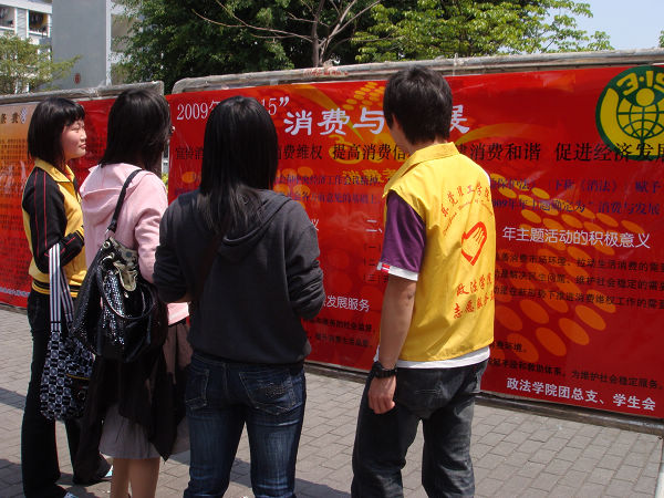 为了纪念“3?15国际消费者权益日”,进一步维护消费者的合法权益,增强同学们健康消费意识,政法学院团总支、学生会于3月12日、16日在校内开展了“3?15消费者权益日”系列维权活动。