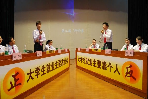 当晚,外语系辩论队与工商管理学院辩论队围绕“大学生就业主要靠社会还是个人”的辩题展开激辩,最后外语系辩论队以1分优势险胜管理学院辩论队,夺得冠军;工商管理学院辩论队获得亚军。