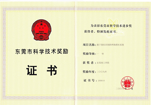近日,由我校独立完成的项目“基于指纹识别的网络授权系统”获得了2009年东莞市科学技术进步奖一等奖,该项目于2007年分别获得了广东省、东莞市科技计划项目的资助,项目组在项目负责人、工程技术研究院副院长袁华强教授的带领下,高质量地完成了任务,取得了良好的社会经济效应。