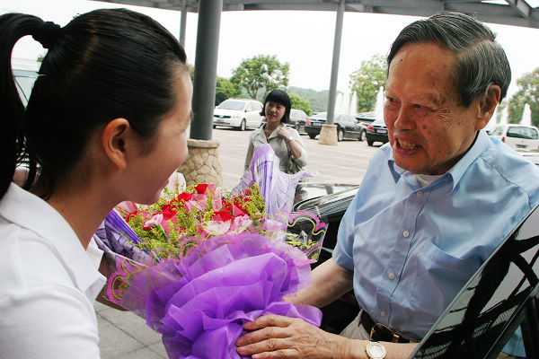 我校学生向杨振宁博士献花,欢迎名誉校长的到来