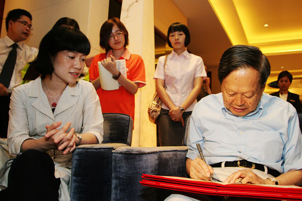 杨振宁博士在今年“杨振宁奖学金”获奖者证书上签字
