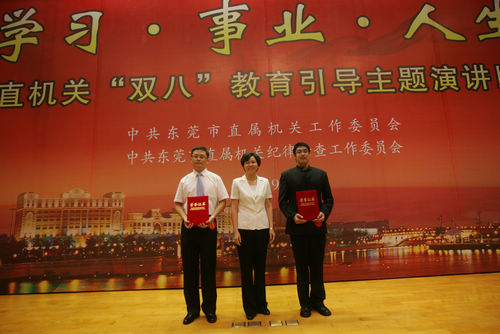 9月25日上午,东莞市直机关“学习?事业?人生”主题演讲比赛决赛在东莞市会议大厦举行,邓磊老师代表我校参赛,并以最高分获得一等奖。东莞市委常委、市委组织部部长庞国梅为获得一等奖的选手颁奖。