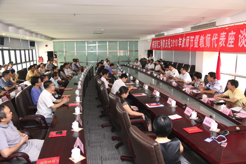 9月9日下午,我校召开庆祝2010年教师节暨教师代表座谈会。学校领导周致纳、杨晓西、王江水、黄碧莲、邹晓平、戴炳源,有关部门负责人以及教师代表共70多人参加了座谈会。