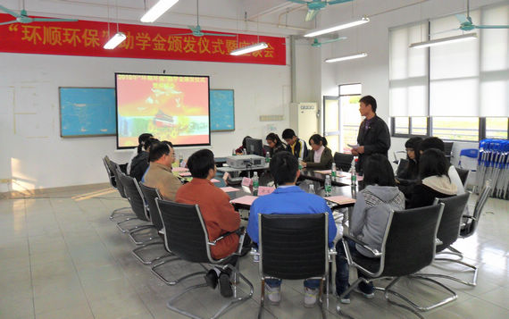 12月27日下午, 2010年“环顺环保”助学金颁发仪式暨座谈会在机电化工大楼12E103会议室举行。东莞市环顺环保器材有限公司行政副总经理孙新成及相关负责人。化学与环境工程学院党总支书记、院长范洪波教授,党总支副君光老师和受助学生等参加了本次座谈会。