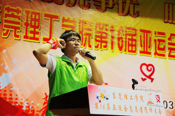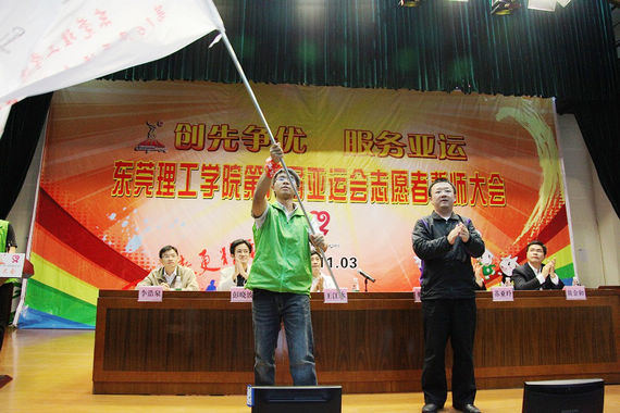 11月3日,我校在学生活动中心小剧场举行了题为“创先争优,服务亚运”的第16届亚运会志愿者誓师大会。校党委副书记王江水,学生处处长邢大立,校团委书记彭晓波,学生处副处长苏亚玲,团市委宣传部部长、东莞市志愿者协会秘书长、第16届亚运会东莞体育馆团队人力资源部经理李浩泉等出席了大会。
