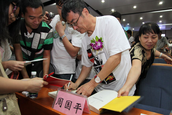 周国平先生的讲演星期四开讲,星期三晚上发放门票,为了得到有限的门票,同学们当天晚上早早就到门票发放处排起了长龙,有的同学提前一个多钟就去排队了。不仅如此,还有同学通过微博、QQ等求票,就是为了一睹周国平先生的风采。在讲座的现场,报告厅的3个进出口都挤满了人,他们全程站着听完了讲演。