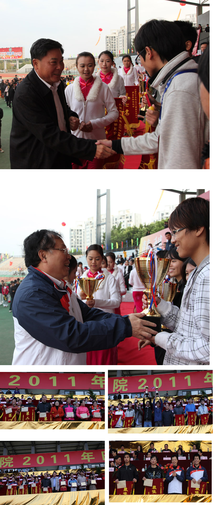12月9日,我校2011年田径运动会圆满落下帷幕。学校领导周致纳、杨晓西、黄碧莲、吕琦元、戴炳源、李忠红等出席了闭幕式,并为获奖代表队颁奖。