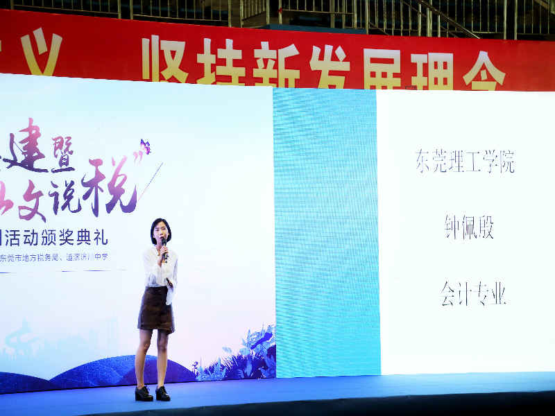 随后,以东莞市国家税务局编排的节目《墨香琴韵》拉开了活动第二项环节——“以文说税”分享会的序幕。我校钟佩殷同学在分享会上尽显大学生的风采,面向主办单位的相关领导,出席代表与全市获奖学生,自信满满地讲述自己与税收的故事。她深情地分享自己对税收的看法,让在场嘉宾都对税收有了更感性的认识。