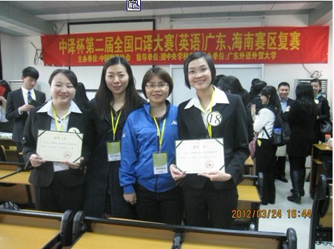 3月24日,中译杯第二届全国口译大赛广东、海南赛区复赛在广东外语外贸大学高级翻译学院举行,我校口译项目指导老师刘瑾带领其口译项目组成员尹瑞尧和李明姣参加了这次规模宏大的口译大赛,外语系陈玉珍老师也观摩了此次比赛。尹瑞尧和李明姣在这次口译大赛中表现出色,尹瑞尧荣获了中译杯第二届全国口译大赛广东、海南赛区复赛二等奖,成功晋级到下一轮华南赛区的决赛,李明姣荣获了中译杯第二届全国口译大赛广东、海南赛区复赛三等奖,这是我校有史以来在省级口译大赛中取得的最好成绩。