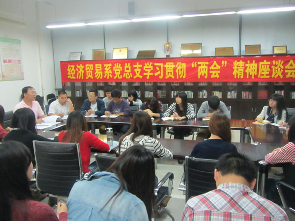 为了深入学习贯彻两会精神,3月20日晚,经贸系党总支召开学习贯彻两会精神座谈会。在经贸系相关负责人和老师的带领下,全系学生干部和各班学生代表参加了学习。 会上,大家认真学习了2013年两会精神,纷纷谈了自己的感受和体会。同学们认为,2013年两会简朴、务实、高效,充分体现了新一届政府的务实作风;表示一定要刻苦学习科学文化知识,学好本领,将来更好地报效国家。