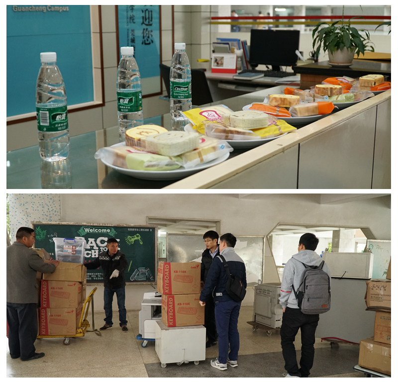 莞城校区管委会还精心准备了早餐糕点,安排了总务办同事随时提供后勤保障工作。经过周末的搬迁,两个学院大部分办公物资已搬至莞城校区。