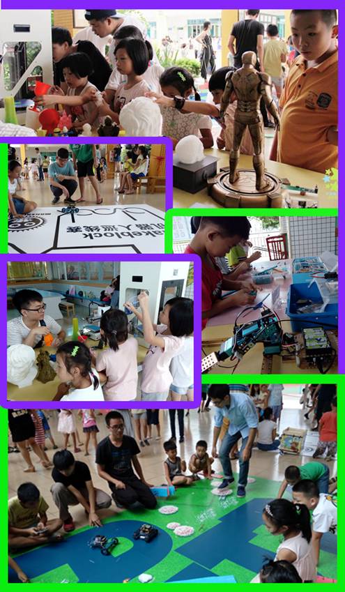 科技小分队由莞工创客空间和3D打印实验室联合组成,辅导员老师带队,队员由来自机械设计、工业设计等5名学生组成。活动当天下起绵绵细雨,没有了酷暑的炎热,小朋友显得更加兴奋和活跃。活动现场设置了3D打印展示区,巡线机器人观摩区,机器人小车制作区。新颖、独特的瓦力机器人,可爱的小黄人,正义的钢铁侠吸引了不少小朋友的眼球。科技小分队携带了一台中型并联式3D打印机和一台微型桌面3D打印机,现场演示3D打印作品制作过程,工作人员向小朋友和家长们讲解有关3D打印和机器人方面的知识。巡线机器人观摩区和机器人制作区,同样热闹非凡,在工作人员的指导下,小朋友拿起螺丝刀等工具动手制作创意机器人,机器人作品成型后,经工作人员的调试,小朋友还用他们拼装好的机器人进行了比赛,初步体验了科技竞技的乐趣。中堂镇青少年对3D打印和机器人的热情及关注度远远超出同学们的预期,根据现场情况,同学们临时决定放弃制定好的机器人比赛路障和规则,由现场选手自由发挥。