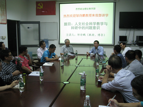 11月5日晚,邹诗鹏教授就“人文社会科学教学与科研中的问题意识”与思政部的老师进行了深入的交流。为了扩大学术影响力与增强校际交流,广东医学院社科部的老师也应邀参与此次座谈。