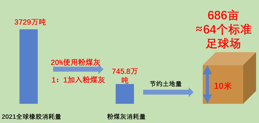 据悉,2021年全球橡胶消耗量为3729万吨,如果20%的橡胶消耗量使用粉煤灰作为补强填料,粉煤灰的消耗量将达到745.8万吨。假设粉煤灰堆积高度为10米,将节约用于堆积粉煤灰的土地686亩,大约为64个标准足球场。如果把粉煤灰的使用扩展到整个高分子行业,将大大提高粉煤灰的消耗,体现出良好的经济效益、环境效益和社会效益,用实际行动践行“绿水青山就是金山银山”的环保理念。