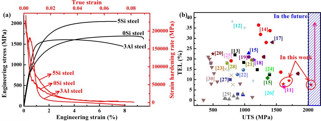 汽车轻量化是显著提升新能源汽车续航里程的重要手段,其主要目标是实现汽车用钢的高比强度、比刚度和良好的塑性、韧性,传统的加Al中锰钢虽然具有较强的轻量化能力,但是Al的加入会引起连铸时堵塞水口、降低刚度、物相控制复杂等缺陷。孙振忠院长研究团队采取以Si代Al的方法,并针对常规加Si会恶化钢性能的传统观点,科学设计组分与制备方法,在我校多物理谱仪上通过实验研究了Si的加入对组织、位错状态及力学性能的影响规律,发现5Si中锰钢热轧板具有良好塑性的原因除了传统的TRIP效应外,相比于不加Si和加Al的中锰钢还具有高螺型位错含量,提高了马氏体的变形能力以及加工硬化能力。
