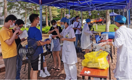 医务人员在考场外的待转运区、临时医学分诊区为考生复测