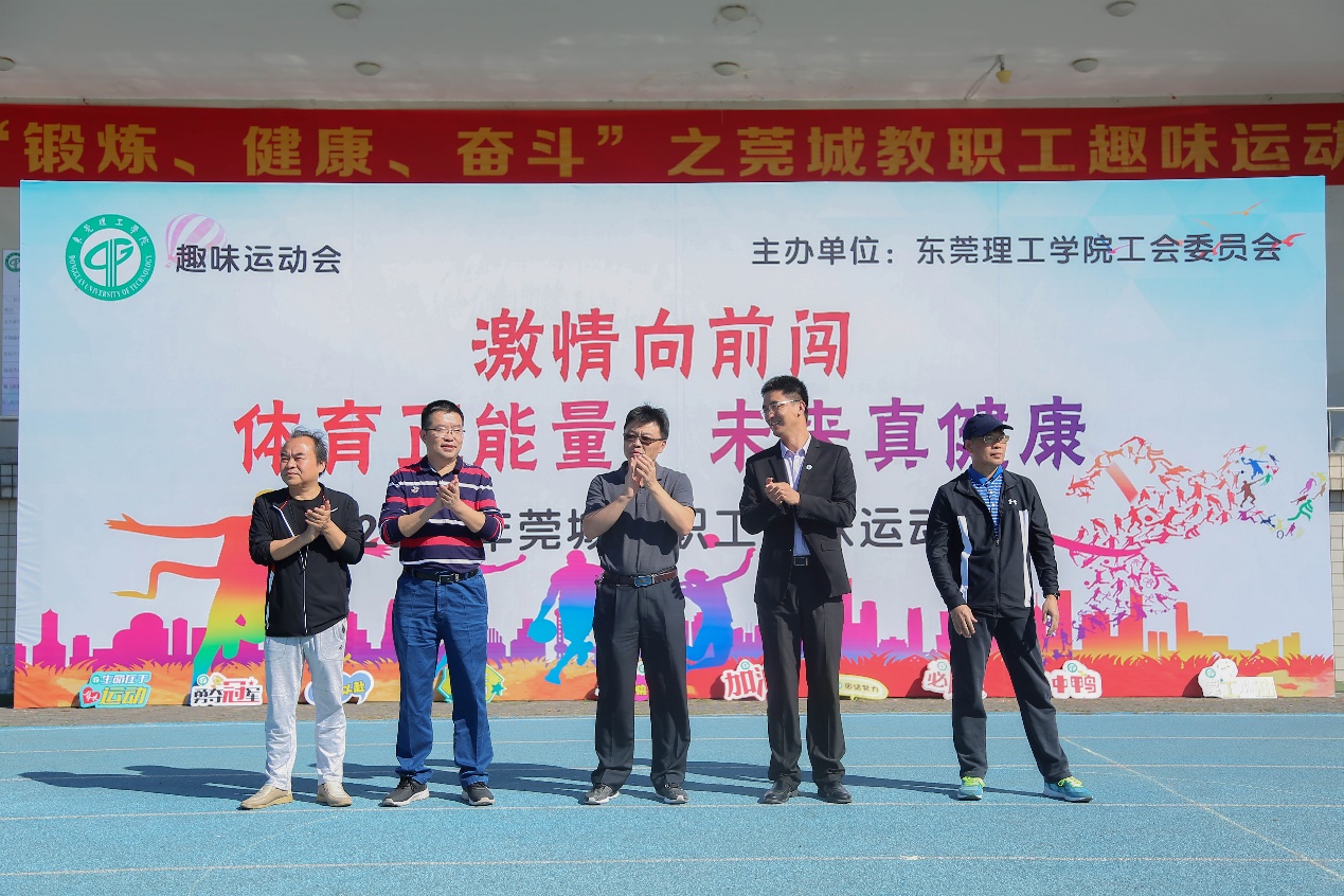 莞城校区党工委书记、管委会常务副主任刘健,莞城校区党工委常务副书记、校工会副主席、莞城校区工联会主席潘荣新,经管学院党委书记杨继学、粤台学院院长陈伟、继续教育学院院长刘伟等出席趣味运动会的开幕式。刘健鸣响汽笛并宣布趣味运动会开幕,主持人带领全体参赛教职员工做热身体操。