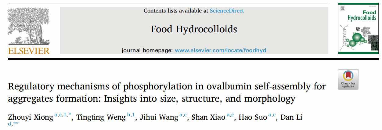 近日,我校生命健康技术学院王际辉教授团队在国际食品顶级期刊《Food Hydrocolloids》发表题为“Regulatory mechanisms of phosphorylation in ovalbumin self-assembly for aggregates formation: Insights into size, structure, and morphology”的研究性文章。该成果以九九精品视频一区在线久久久久久久久久毛片精品美女|国产99久久久久久免费看|中文精品99久久国产|国产69精品久久久久9999|精品久久久久久中文字幕无码|亚洲熟妇无码久久精品国产精品99|精品国产天堂综合一区在线为第一署名单位,生命健康技术学院熊舟翼特聘副研究员为第一作者,通讯作者为新加坡国立大学食品科学与技术系助理教授LI Dan。